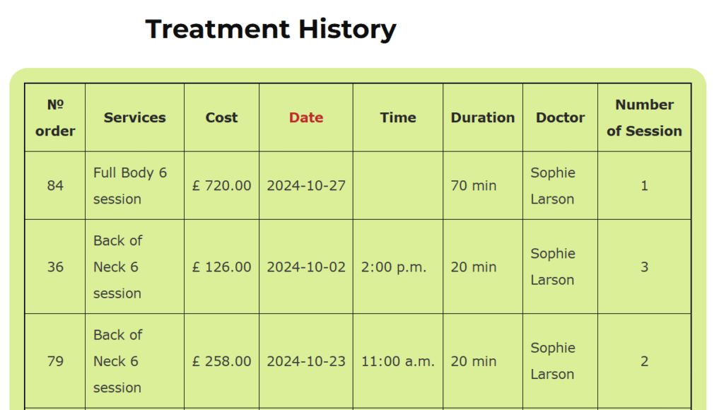 1. Treatment History: Your comprehensive medical history, including dates and thorough descriptions of all the procedures you have had at our clinic. This helps you and your cosmetologists monitor the success of your procedures and make future plans in treatment plan.