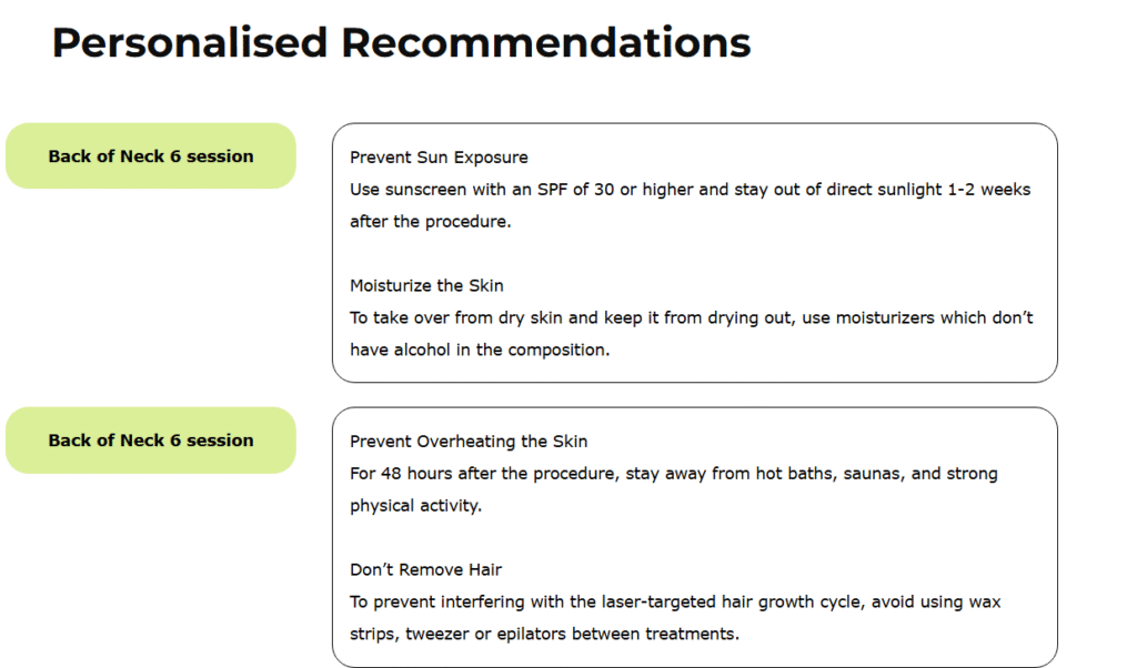 In the “Recommendations” section, you will find all the advice from your cosmetologists. Here you can find a personalised treatment plan, a list of suggested treatments  and home/post care products.