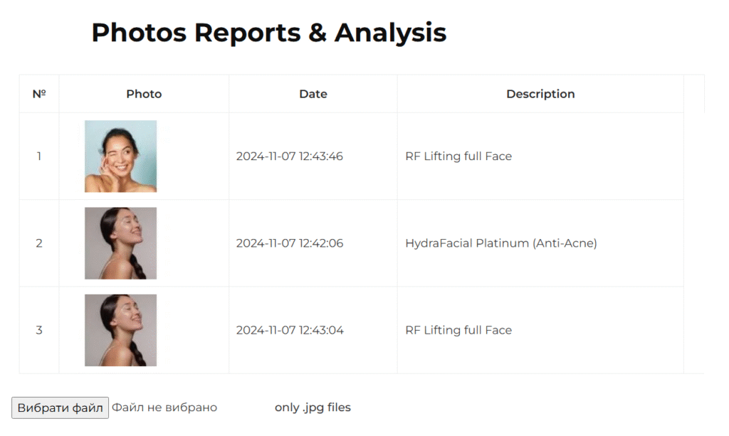 3. Photos Reports & Analysis: You may upload pictures of your skin to track changes over time. Our specialists can also add photo reports from treatments and skin analysis, allowing you to see the progress.