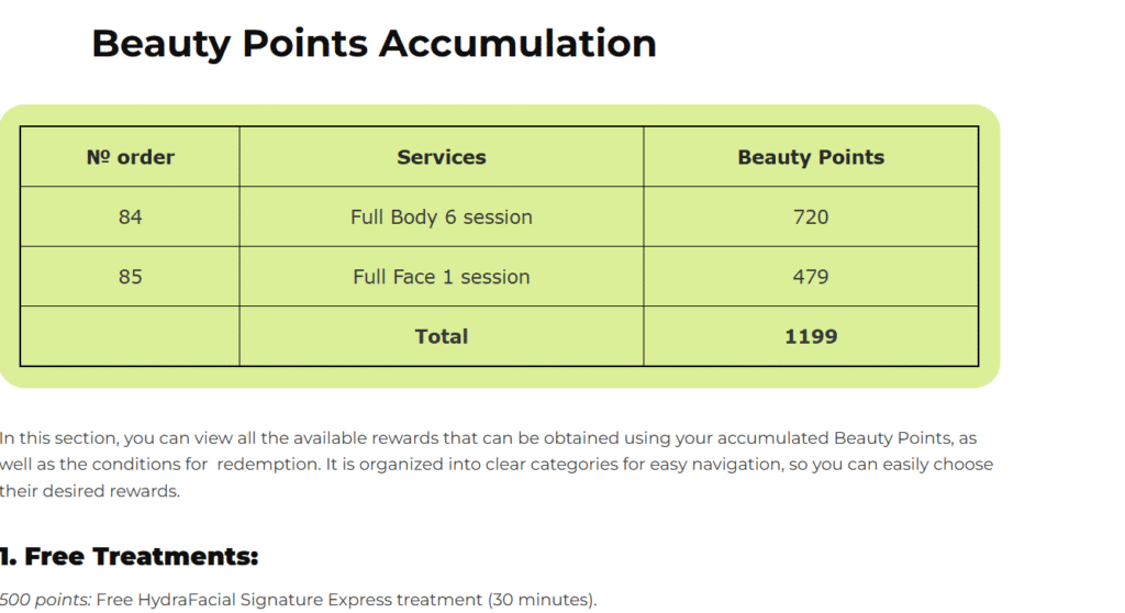 5. Beauty Points Accumulation: The amount of points collected via our loyalty program will be shown on your Skin Passport. You can look at your current points and the available awards that can be traded for treatments or products.