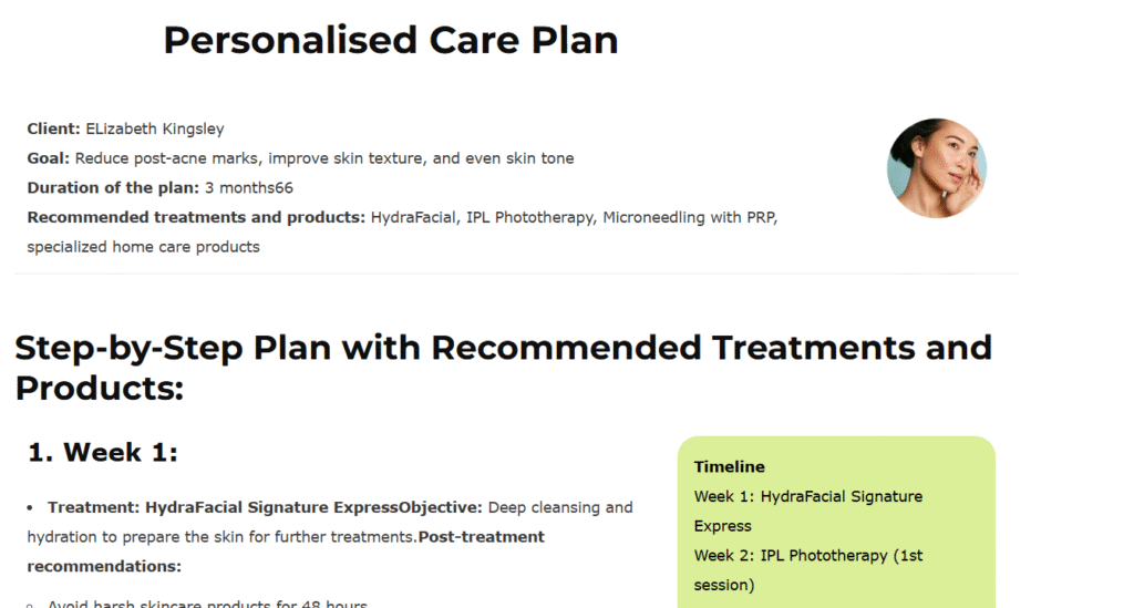 6. Personalised Care Plan: A custom-designed plan, which includes recommended treatments, products, and home care routines. This plan will be updated by our cosmetologist in response to any changes in your skin condition and the outcomes after the treatments